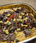 Our famous Brisket Queso! Seasoned cheese dip  topped with Texas Caviar and Southern Style Shredded Beef Brisket. Always a crowd pleaser.