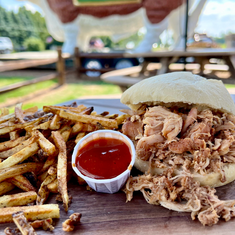 No, but there are a full range of condiments including BBQ Sauces and Relish at the pick up window. Dress your BBQ as you like!